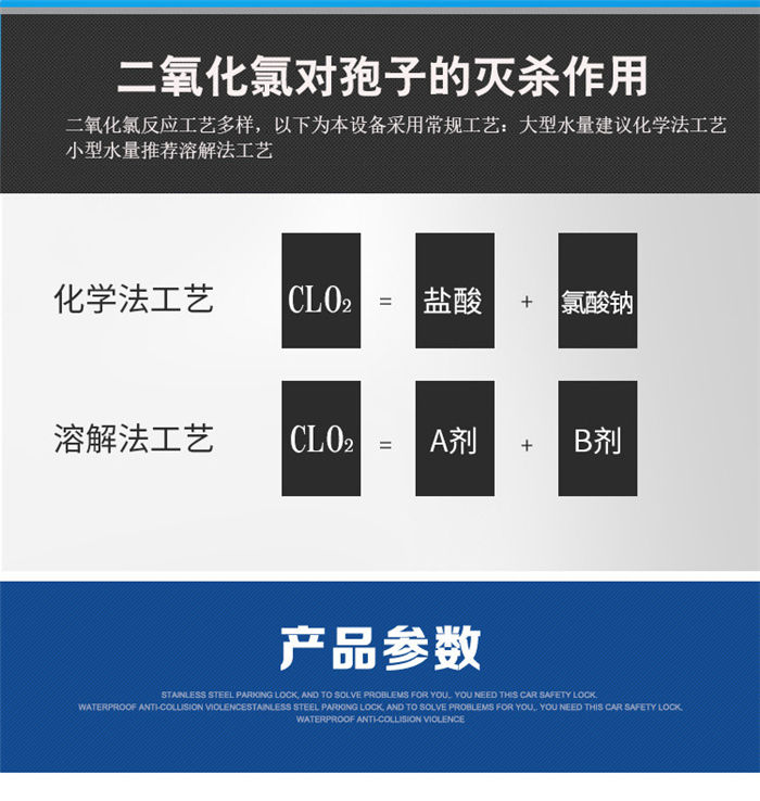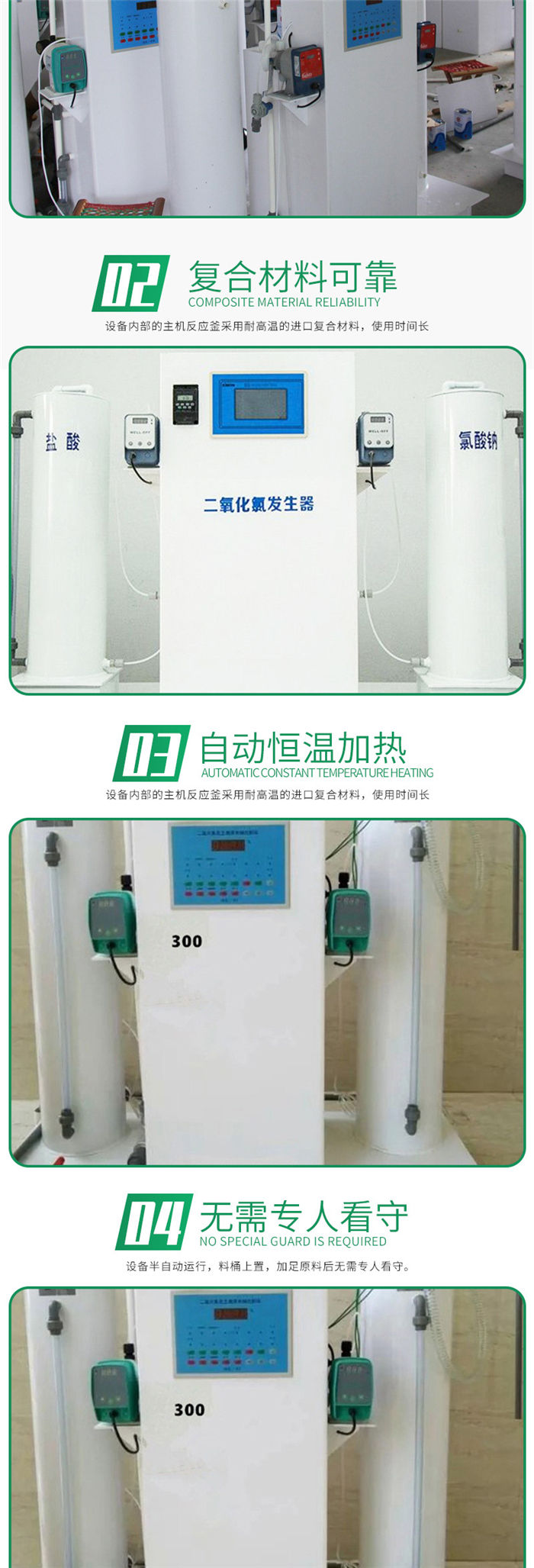 二氧化氯發(fā)生器是一個(gè)安全可靠的自動(dòng)閉環(huán)系統(tǒng),化學(xué)藥劑的反應(yīng)過程完全是在封閉的反應(yīng)器中進(jìn)行,而加藥過程又是在封閉的混合器中完成,從而使系統(tǒng)避免了泄漏的可能。