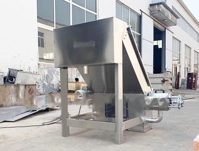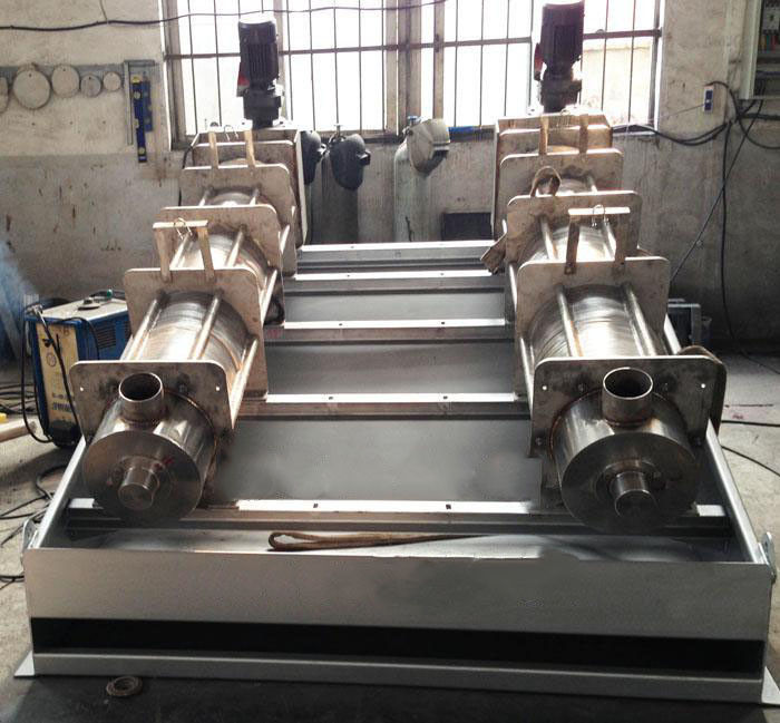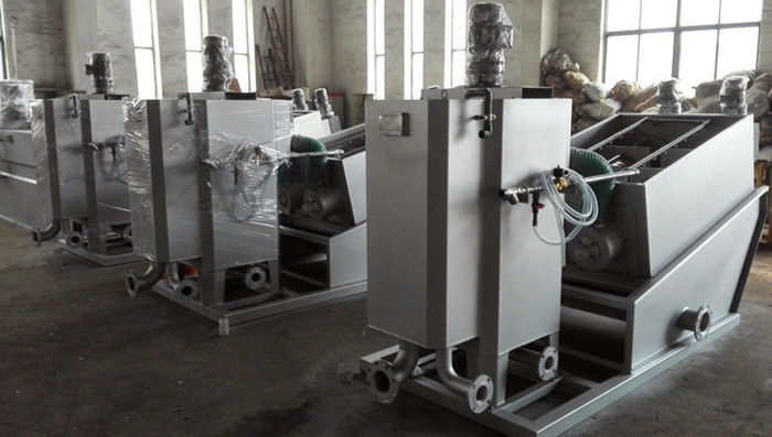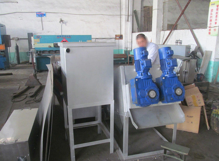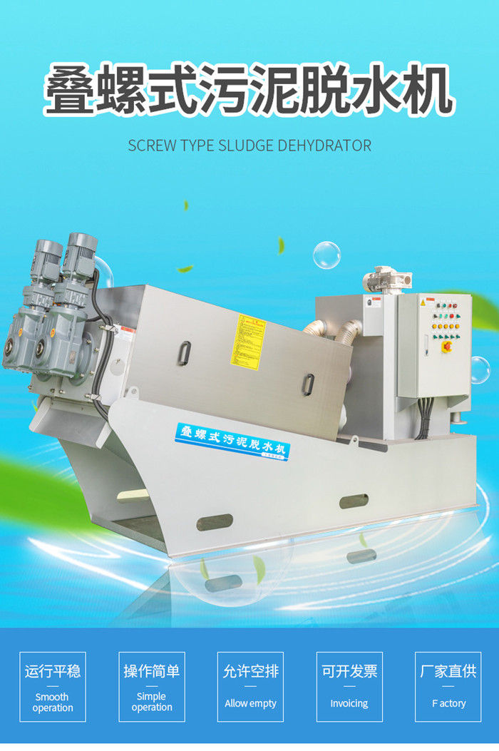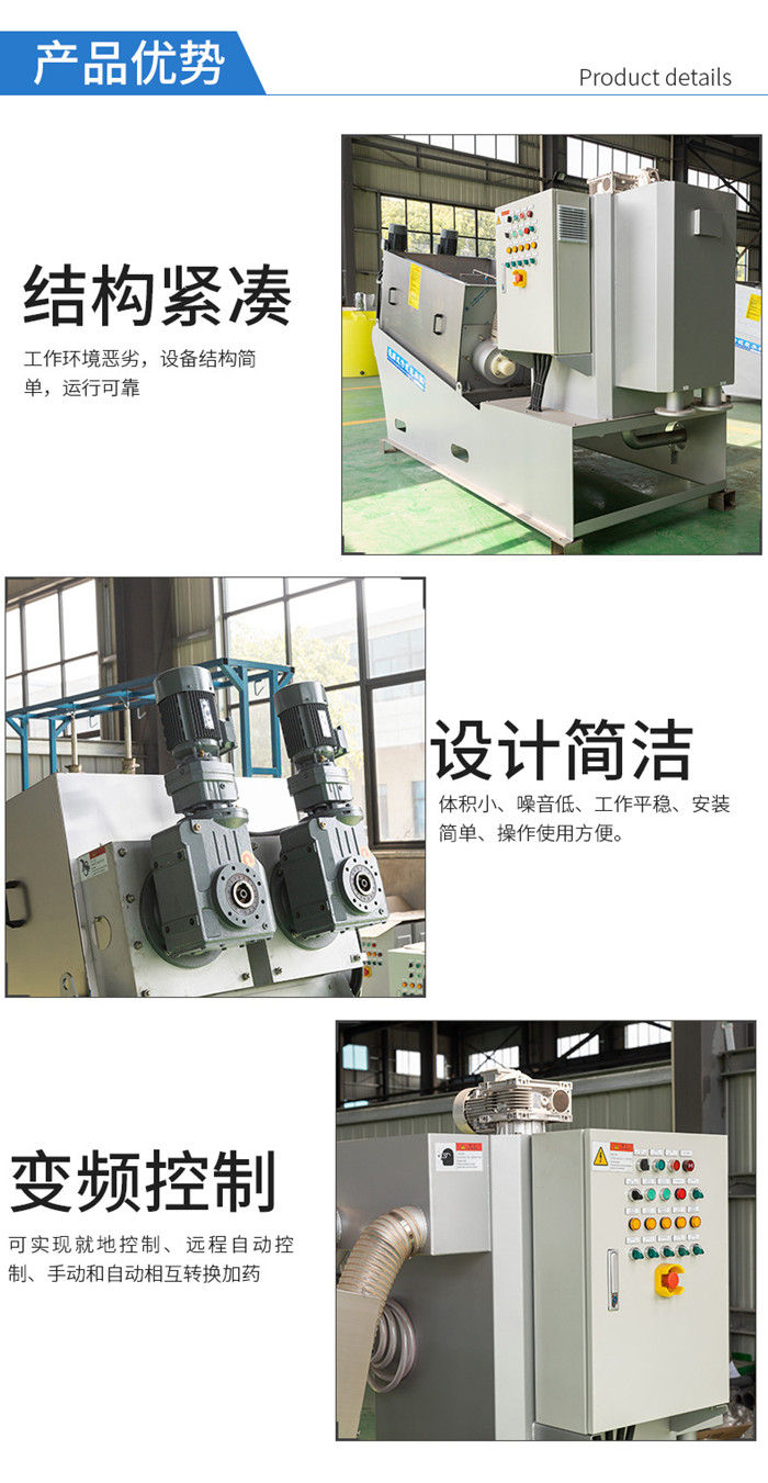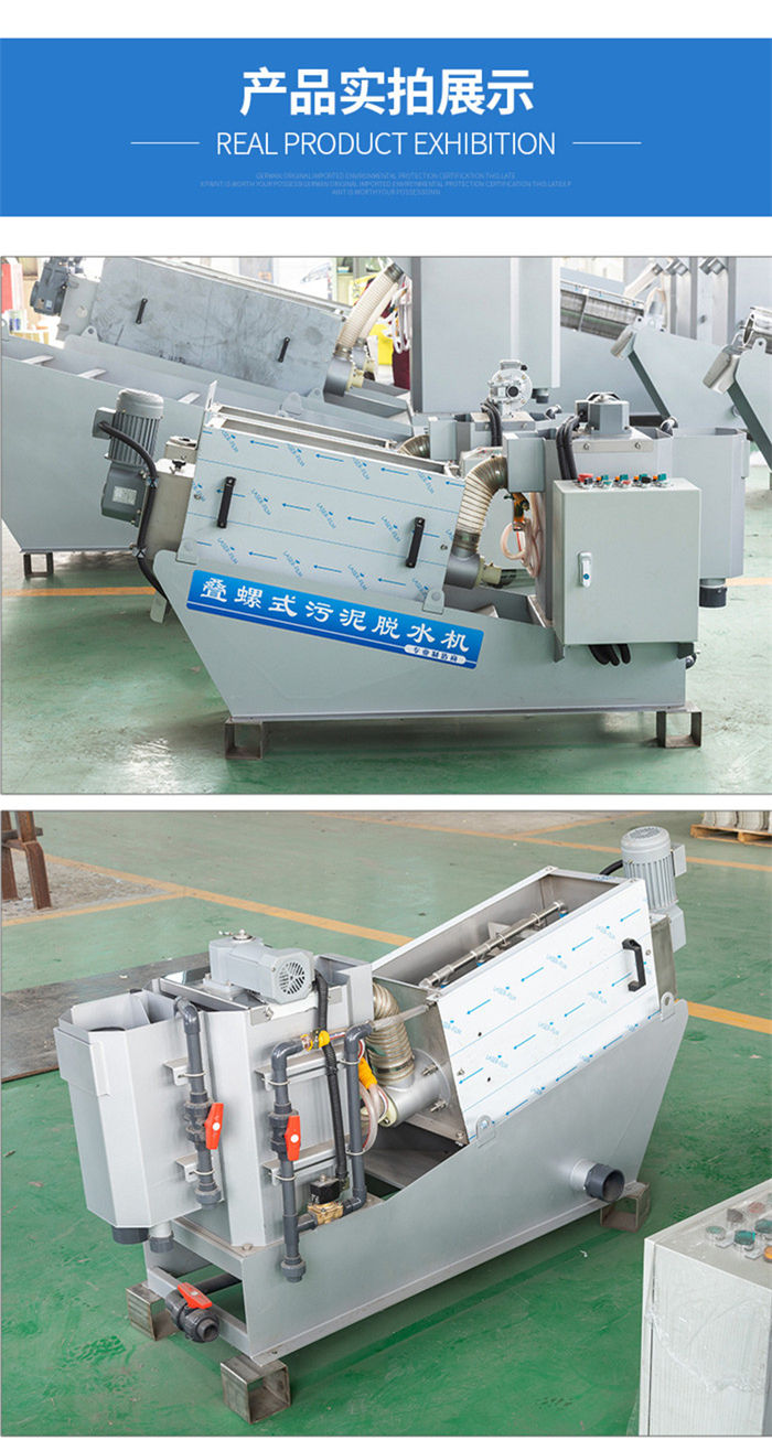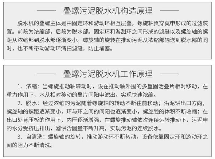 污泥通過泵,輸送至污泥槽,流至混合槽內,同時絮凝劑由加藥泵送至槽內,混合槽由液位控制,防止?jié)M溢。攪拌混合形成泛花,理想泛花象棉花狀,一朵朵的,然后流至過濾機,液體透過動片與定片的間隙流出,固體通過螺旋旋轉不斷向前,在出口壓板的作用下充分脫水,至出口。